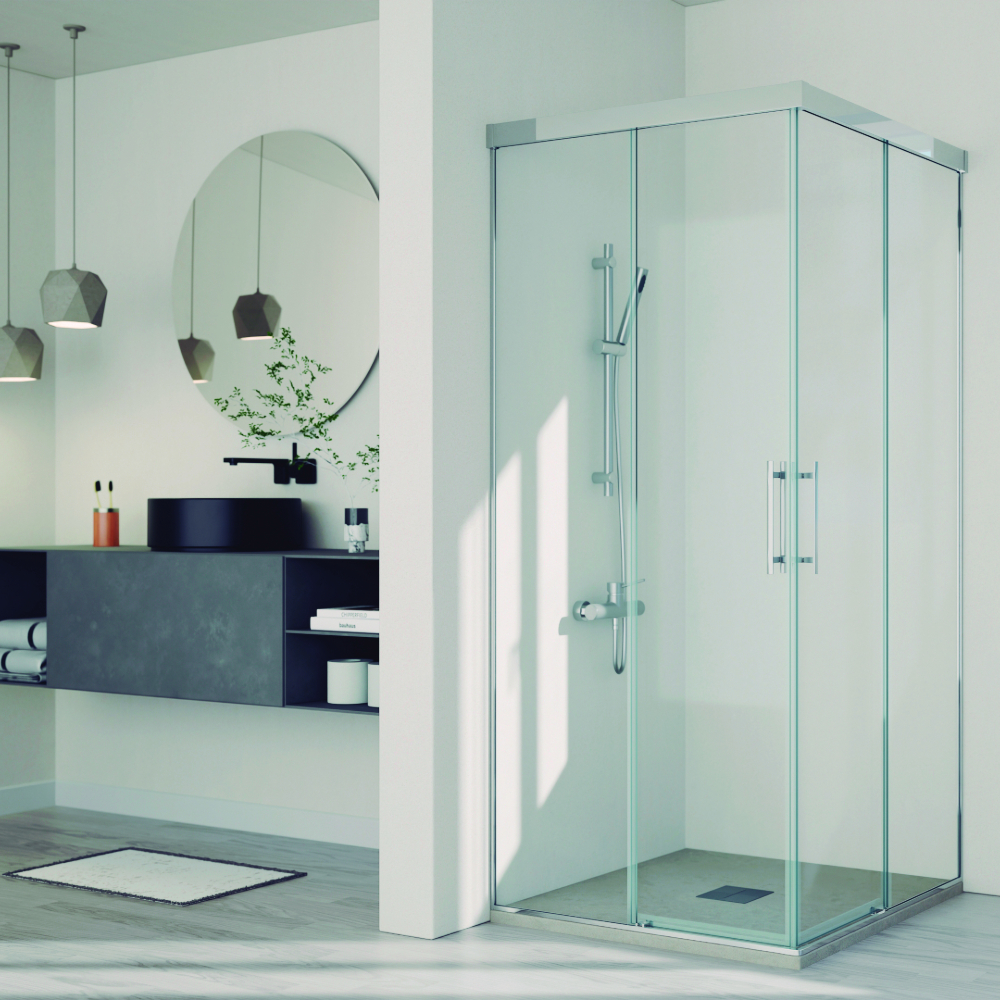 Mampara angular ducha de dos hojas correderas + dos hojas fijas en vidrio templado de 6 mm de espesor. Equipada con cierre magnético de goma imán translúcida en el vértice y perfiles de aluminio lacado o anodizado en guía superior y “u” lateral, con perfil base para una mayor estanqueidad y accesorios en Zamak. Diseño exclusivo de tirador asa doble de 255 mm.