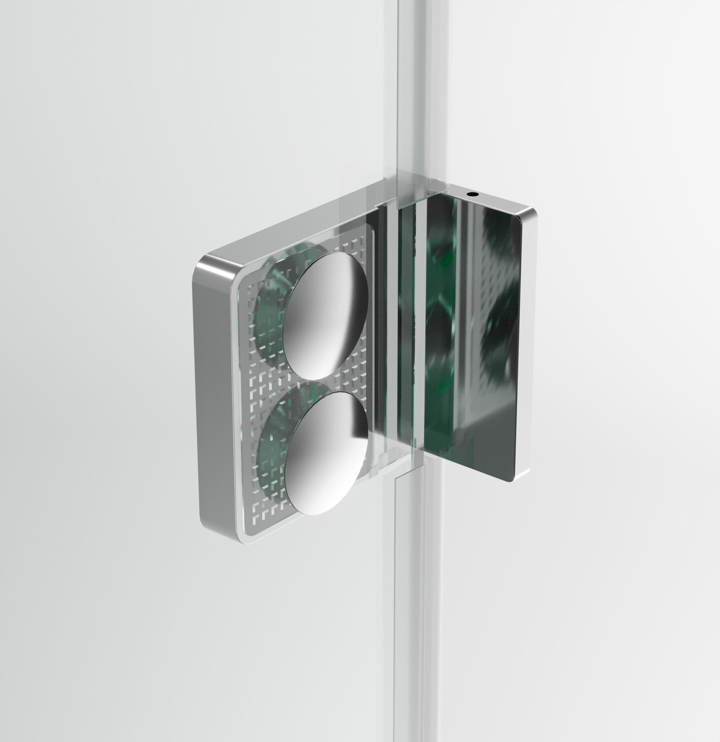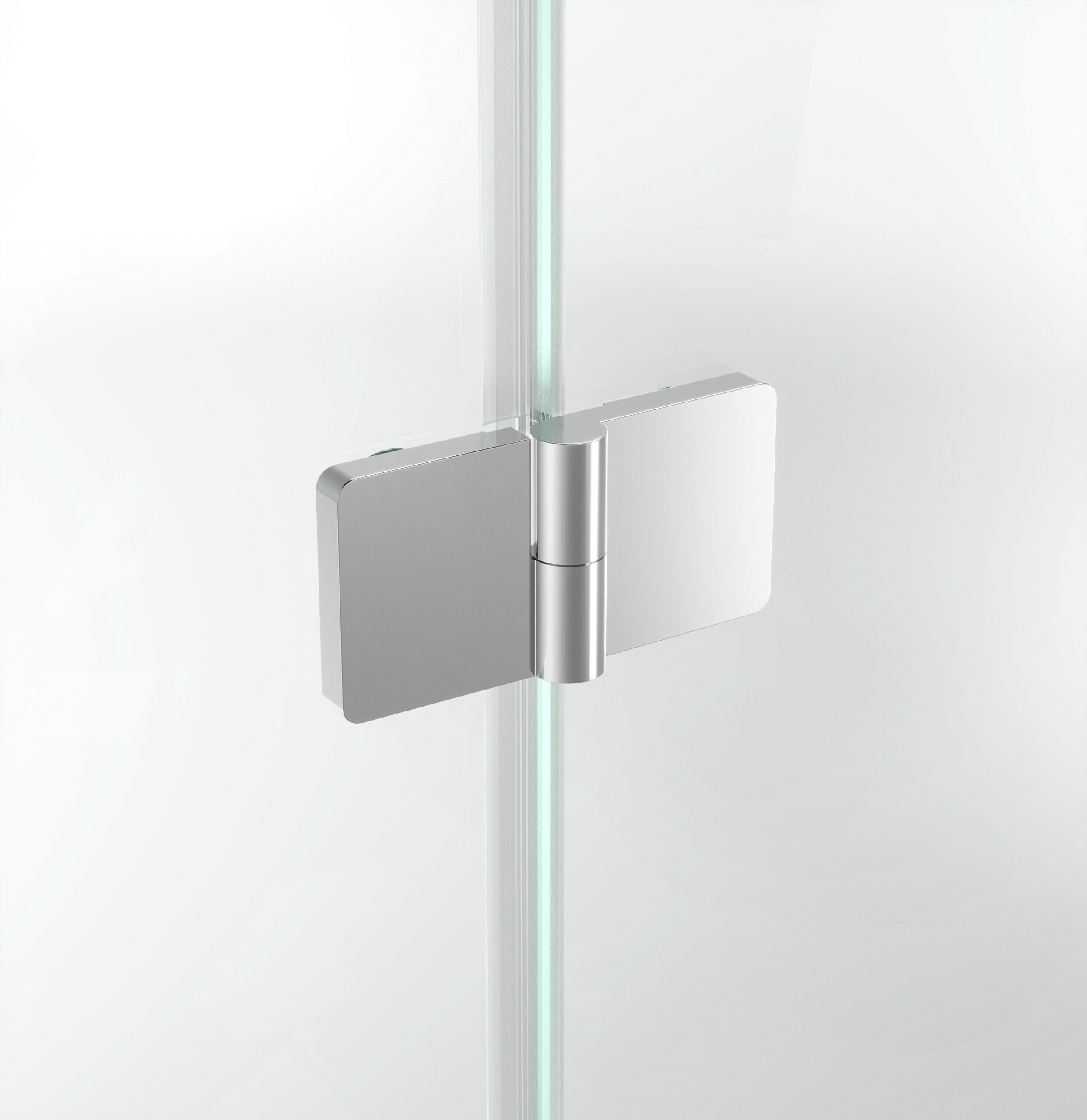 Mampara angular ducha de 1 hoja abatible + 2 fijos en vidrio templado de 8 mm de espesor. Bisagra minimalista de latón y vidrio abatible con giro de 90º exterior. Cierre magnético lateral de goma imán translúcida. Junta de goma inferior en inglete y perfil base de aluminio para una mayor estanqueidad. Diseño exclusivo de tirador asa doble de 255 mm.