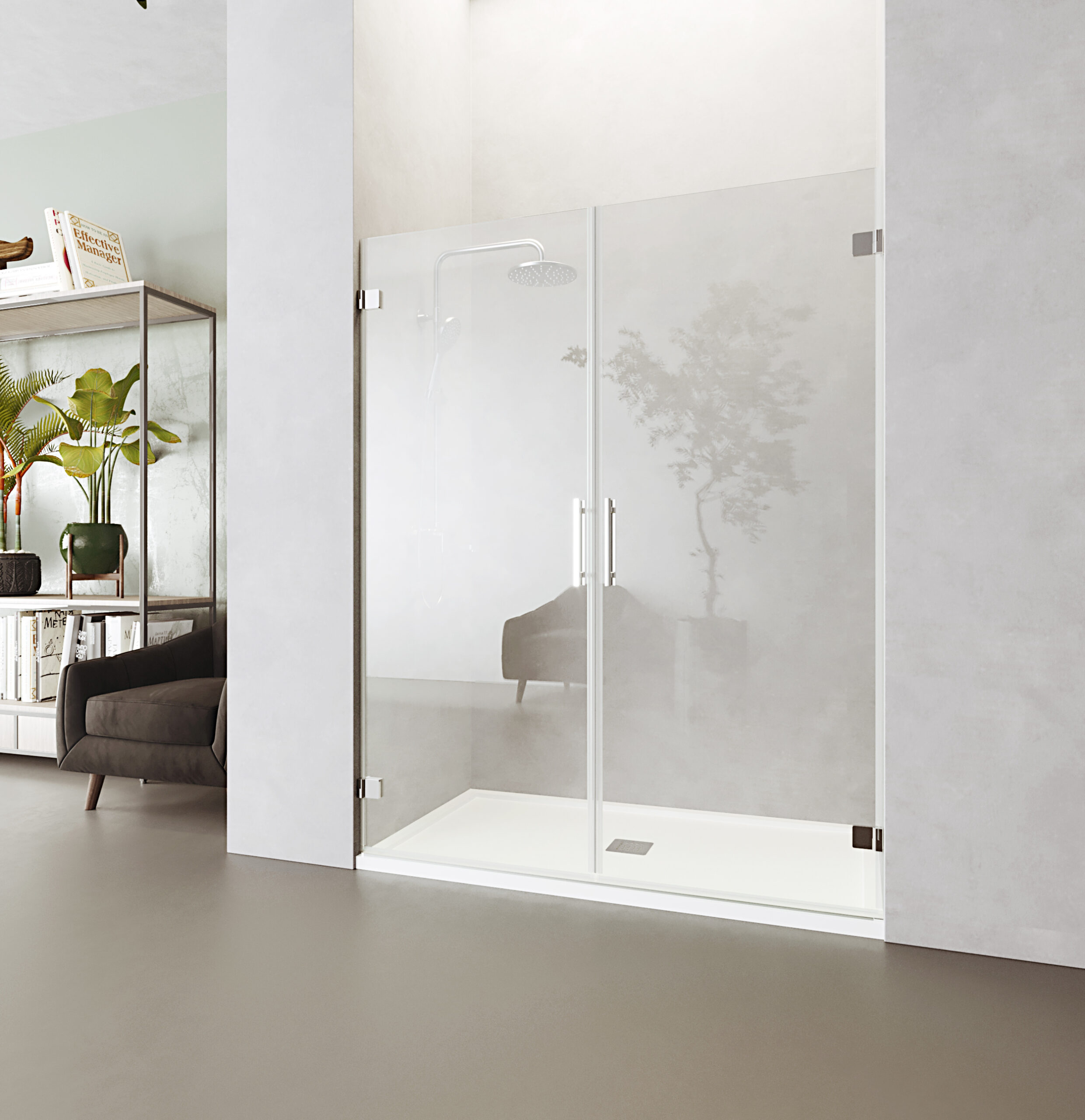 Mampara frontal ducha de 2 hojas abatibles en vidrio templado de 8 mm de espesor. Bisagra minimalista de latón y vidrio abatible con giro de 90º exterior. Cierre magnético central de goma imán translúcida. Junta de goma inferior en inglete y perfil base de aluminio para una mayor estanqueidad. Diseño exclusivo de tirador asa doble de 255 mm.